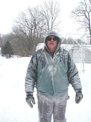 My dilemma has been trying to climb out of the snow drifts that surround me as I pull the snow off the greenhouses and for some apparent reason when it falls it encases me. I then exert tremendous energy trying to free myself from this cold tomb. I have discovered I am married to the abdominal snowman, for as Mark is snow blowing the barnyards and drives here, he is covered in snow & ice crystals. His appearance is one of a snow monster rather than a snowman.