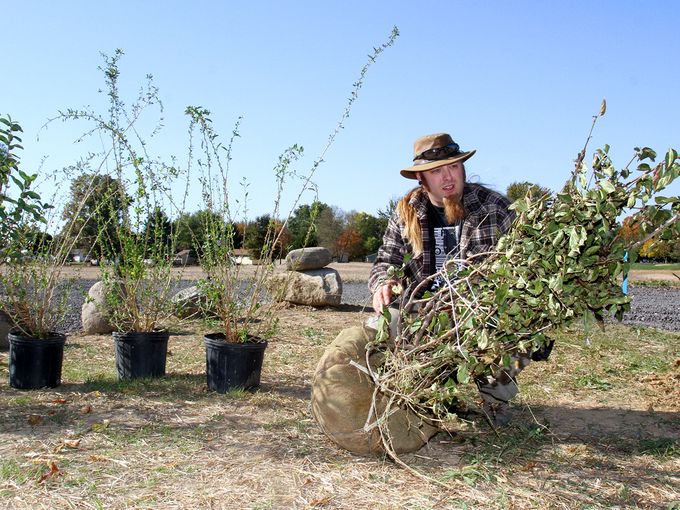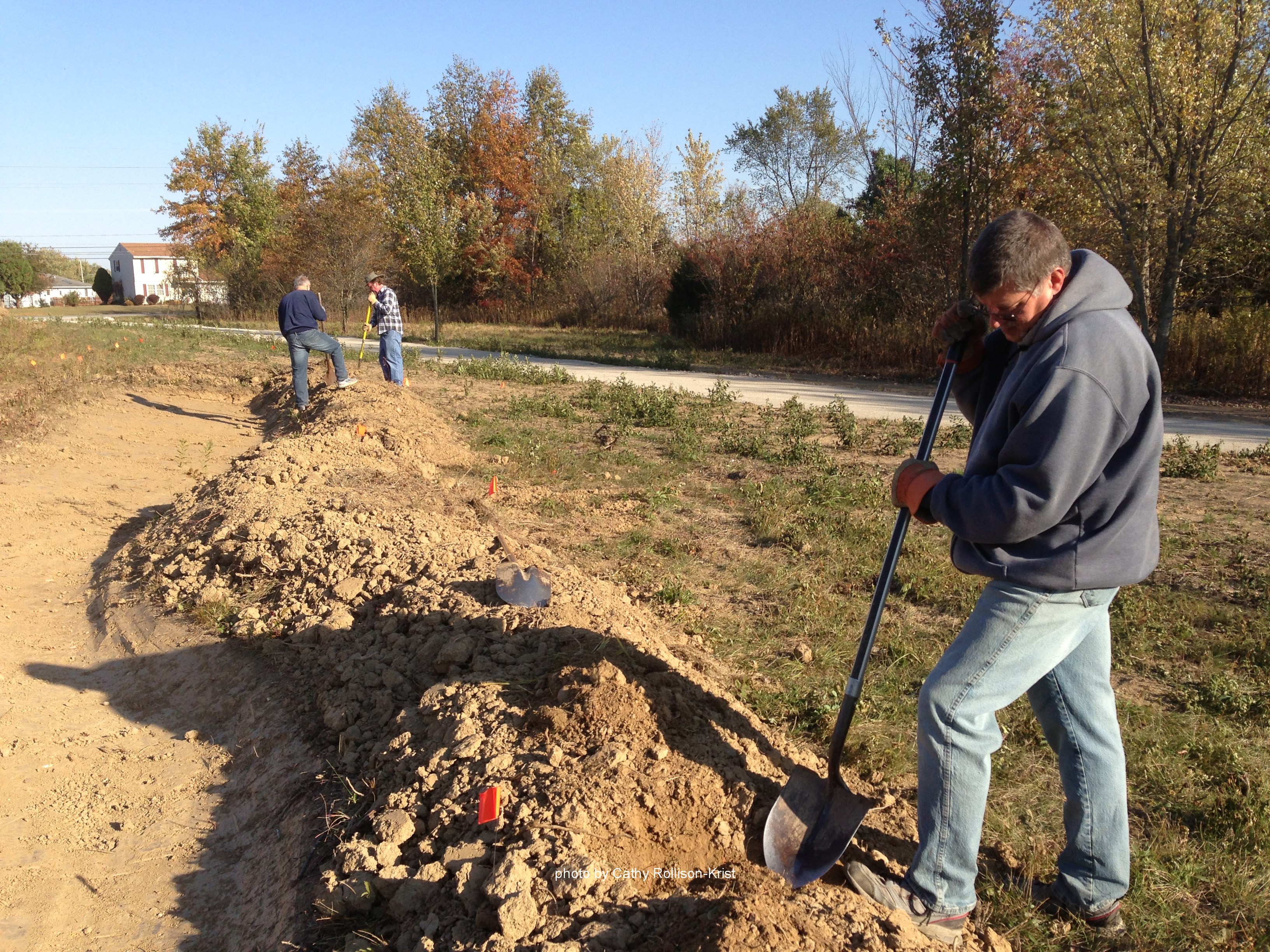 Our Marion Ohio Sustainable Food group have been planning a permaculture fruit tree garden at Sawyer Ludwig Park. Today was a work day to plant in a 100 assorted fruit trees & fruit bearing bushes. We hand dug most of the holes in the hardest rock solid clay “concrete” it was a long long tedious job today. We started at 8:30 am and finished around 2:30pm. The goal was to plant apple, cherry, pear & persimmon trees along with several nut trees and fruit bearing bushes on large mounds. Five of us hand dug the holes while the city workers used a tractor to bring us some bucket loads of organic matter to mix into the clay soil to soften the dirt up for the roots to spread and take hold. We all took turns carrying numerous 5 gallon buckets of water to water the trees & bushes in. By noon we were all getting pretty wore out. After we dug the first 25 holes for the trees the city was able to bring an auger in to dig down a bit deeper and break the soil up. We had a beautiful sunny day and wonderful breeze to keep us pretty cool while working. Here are some pics of our work day.