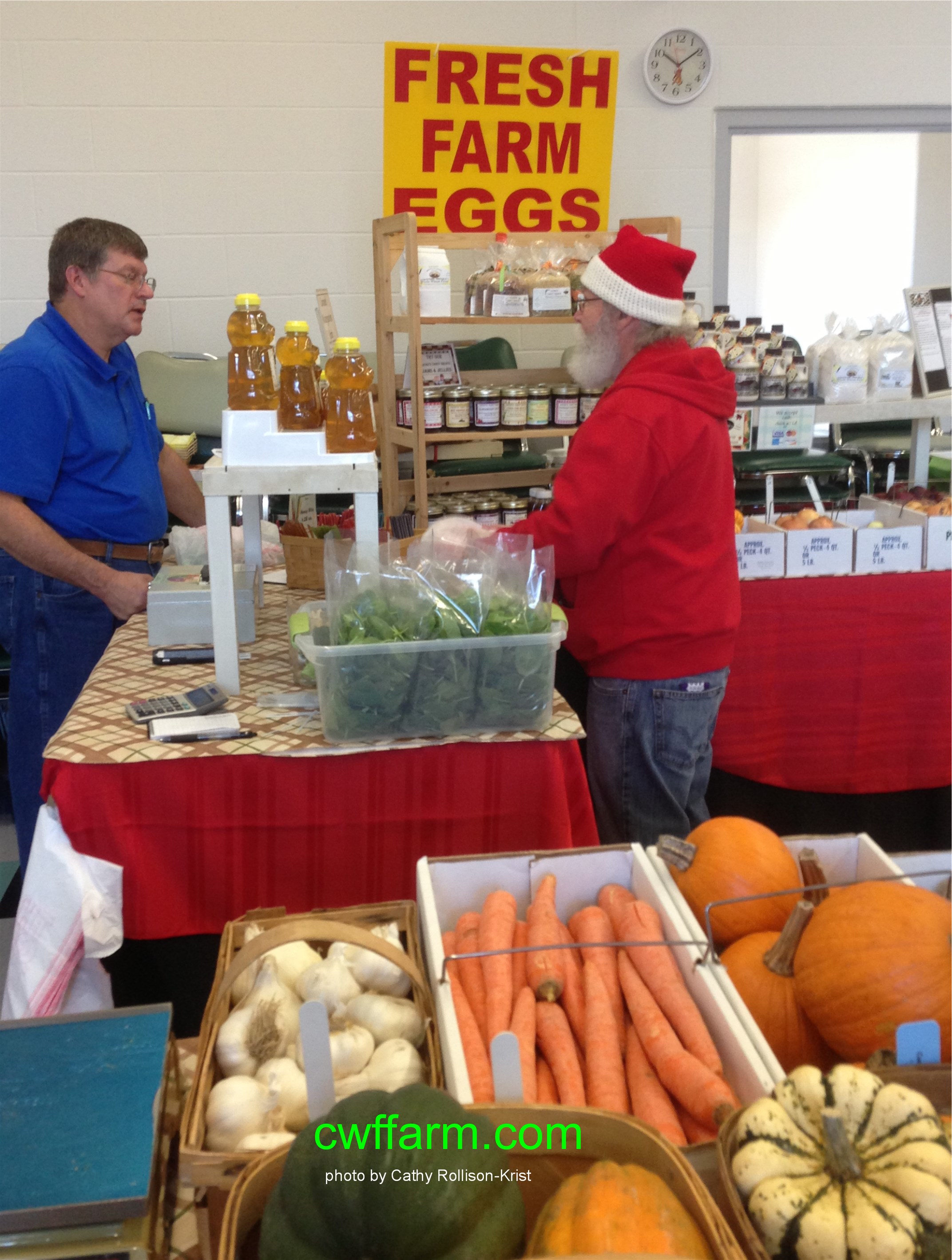 Santa is a good friend of CWFFarm. He heard we were having Christmas from the farm at the Columbus Winter Farmers Market. Santa said he had a hankering for some farm fresh vittles so he stopped by to pick up some eggs & veggies today. We hear tell he is gearing up for a big Christmas eve to visit all the girls & boys across the world. You should have heard how excited my ladies