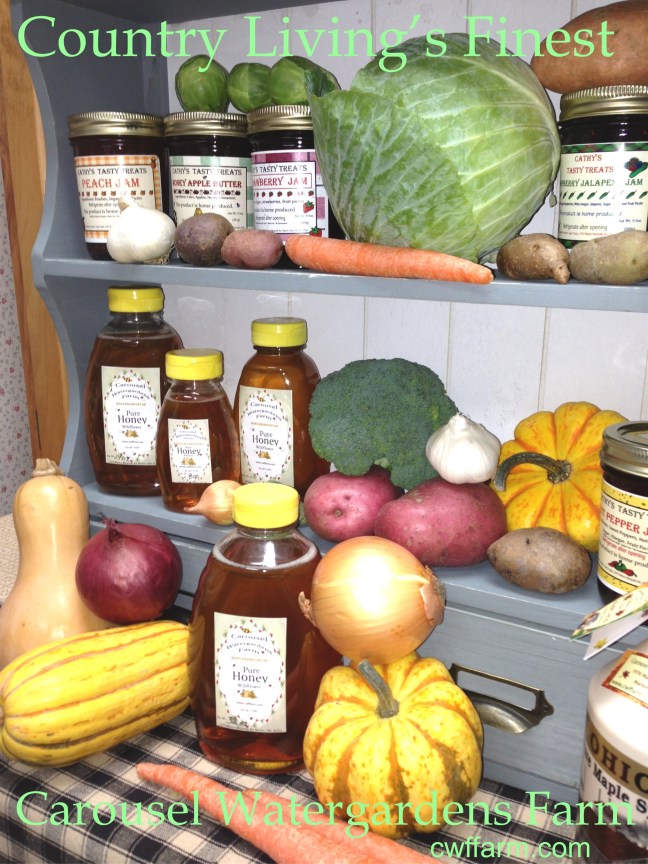 We will have our seasonal produce of broccoli, cauliflower, brussel sprouts, cabbage, carrots, winter squash & pie pumpkins, purple, white, russet & red potatoes, red & yellow onions, garlic, along with our pantry-fare of jams, jellies, honey, maple syrup, popcorn, soup mixes, herb dips, rubs & seasonings, CSA eggs & ground beef and more. Remember everything we sell is raised and produced on our farm. Stop on by and pick up some of country’s finest!